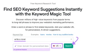 To find the best semantically related terms, tools like Semrush’s Keyword Magic Tool are highly effective. Simply enter your primary keyword, select your target country (optional), and click “Search.” You’ll receive a list of related phrases that can help expand your topic’s reach and relevance.