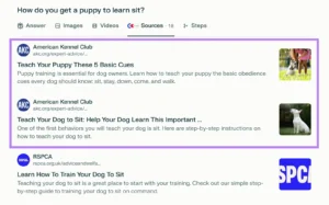 When a user searches for “how to train a puppy to sit,” Perplexity frequently cites multiple pages from the American Kennel Club.